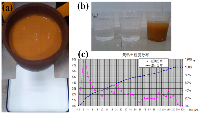 ▲(a)黄黏土尘埃;(b)砂基透水材料对黄黏土浑浊液净化前后及纯净水的比较;(c)黄黏土的粒径分布