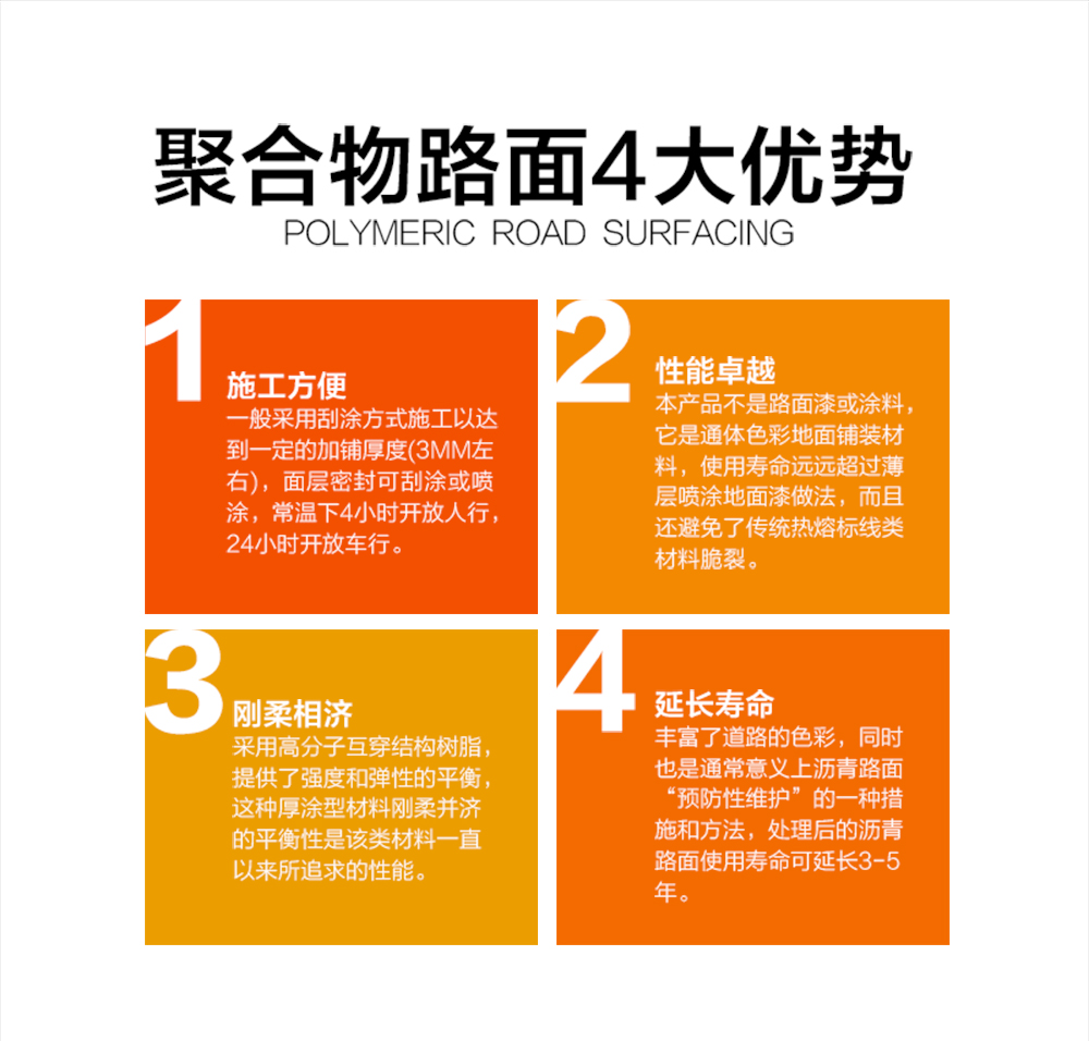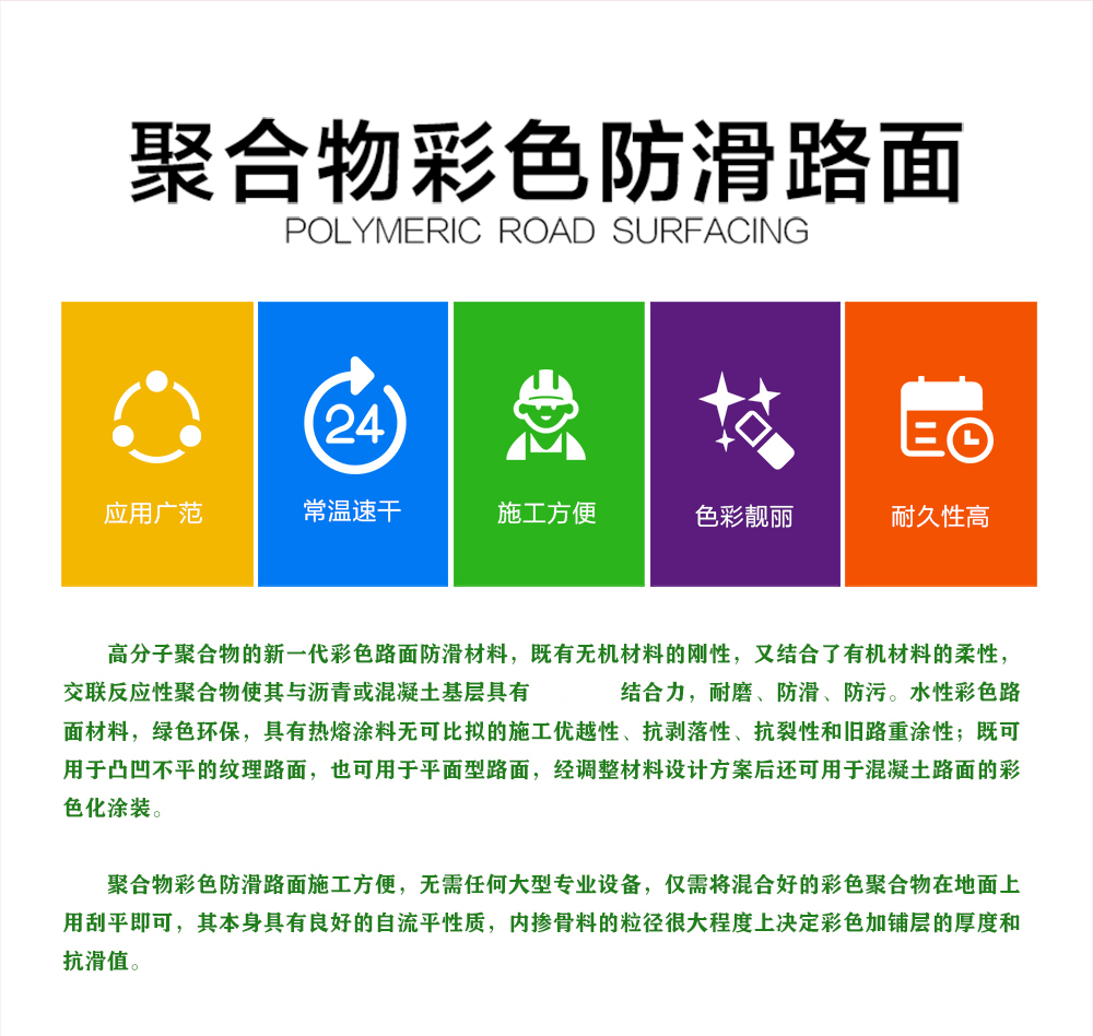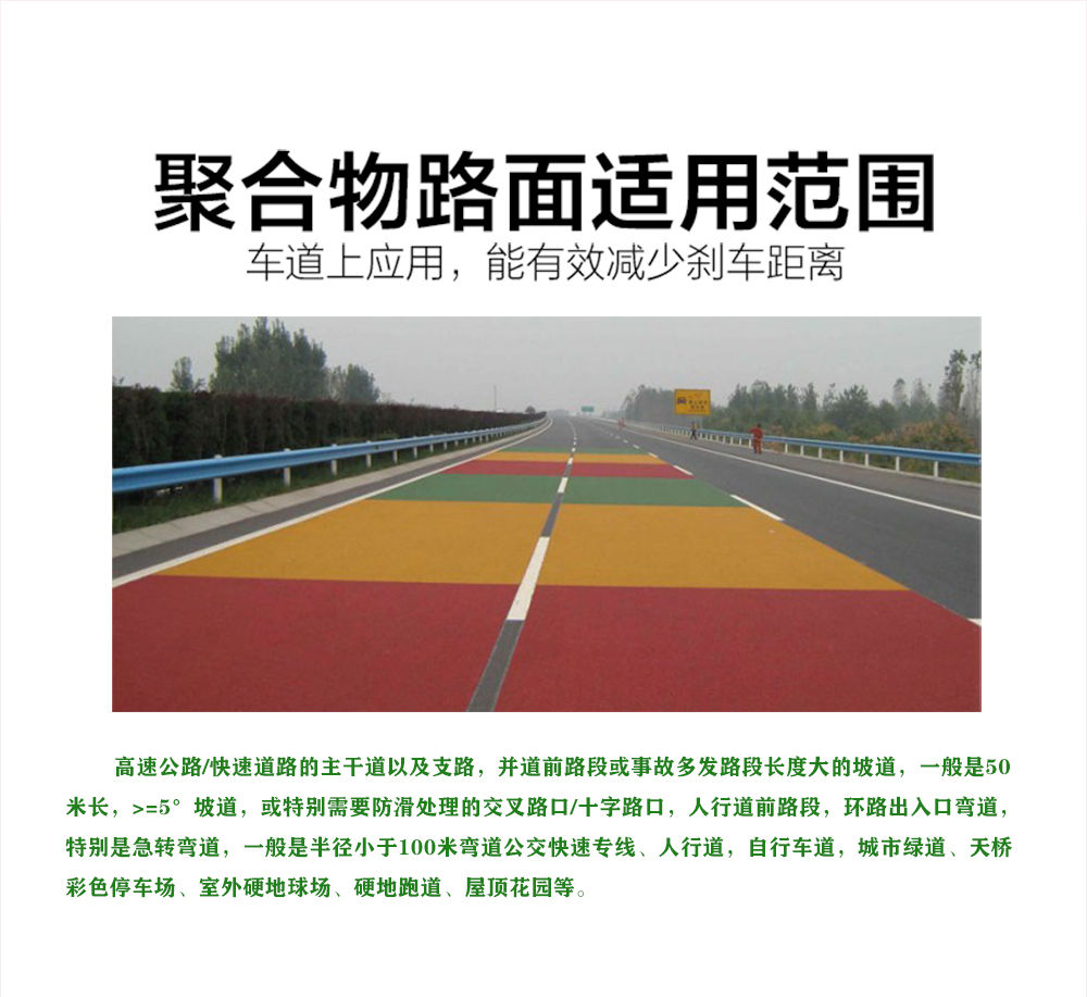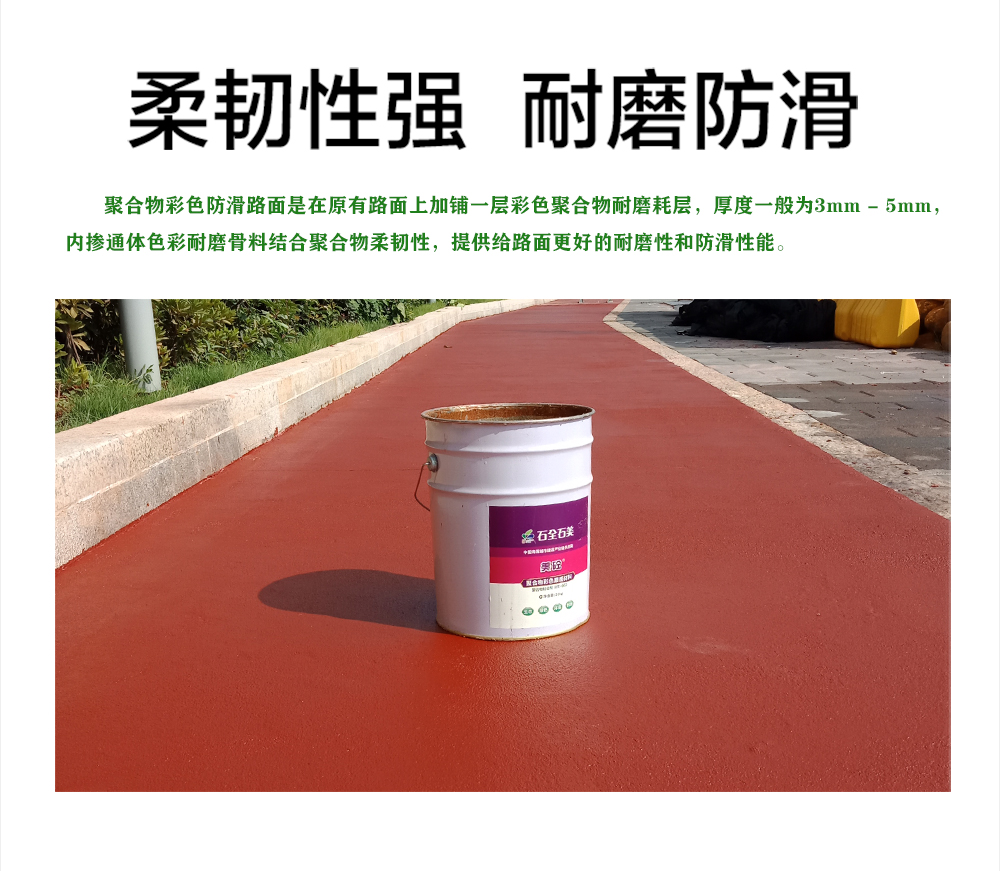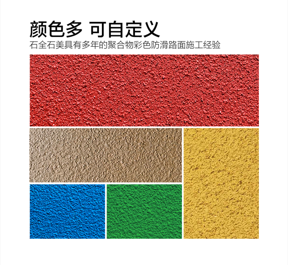 石全石美聚合物彩色防滑路面是在原有道路基础上的加铺,其路面承载能力取决于原路,石全石美聚合物只对原有路面提供更长寿命的保护,和提供耐磨耗的道路彩色化,一般面层厚度为3-5mm足够达到使用要求,部分石全石美聚合物料浆将渗透到缝隙中形成物理嵌锁的界面。
