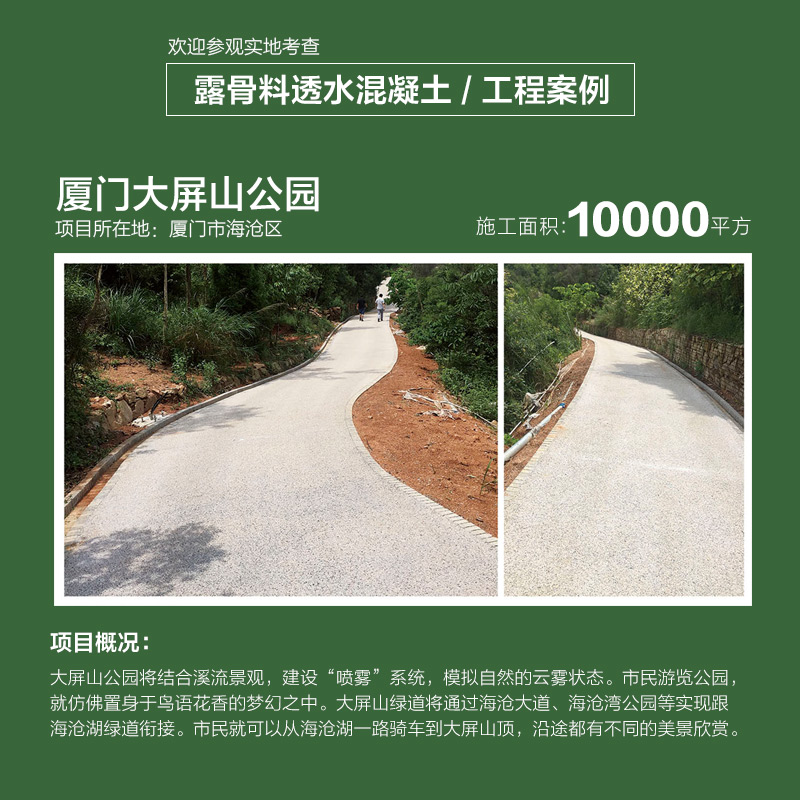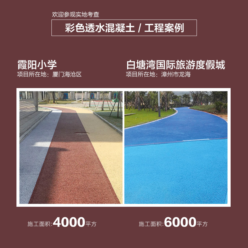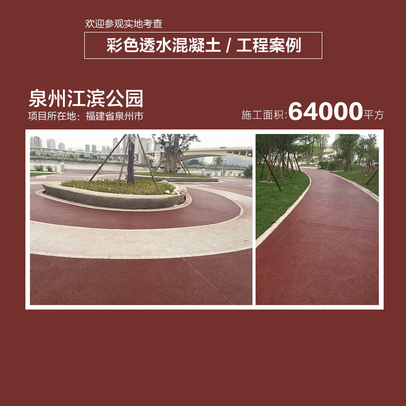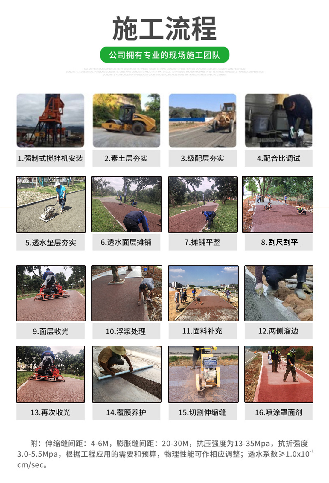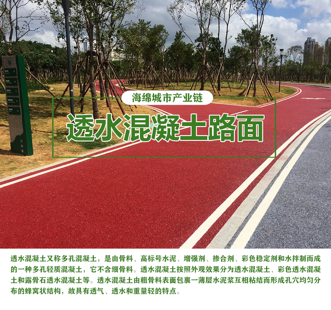 透水混凝土又称多孔混凝土,是由骨料石子、高标号水泥、增强剂、色粉和水拌制而成的一种多孔轻质混凝土,它不含细骨料。透水混凝土按照外观效果分为普通透水混凝土、彩色透水混凝土和露骨石透水混凝土等。透水混凝土由粗骨料表面包裹一薄层水泥浆互相粘结而形成孔穴均匀分布的蜂窝状结构,故具有透气、透水和重量轻的特点。