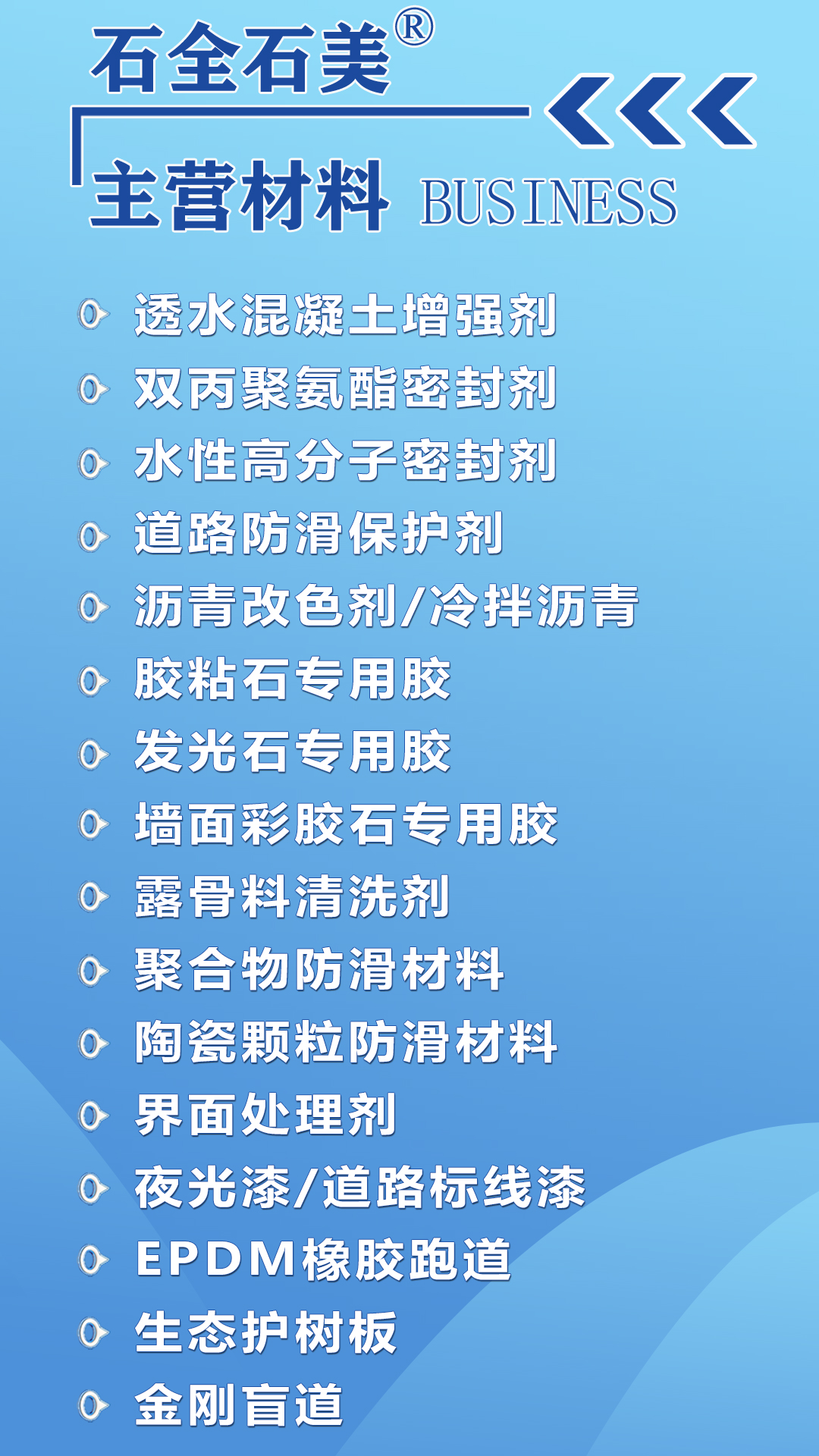 透水混凝土增强剂、双丙聚氨酯密封剂、水性高分子密封剂、道路防滑保护剂、沥青改色剂、冷拌沥青胶、胶粘石专用胶、夜光石专用胶、胶粘石墙面专用胶、露骨料清洗剂、彩色聚合物、界面处理剂、夜光标线漆、现浇盲道、生态护树板(树池)等一系列彩色道路铺装材料。